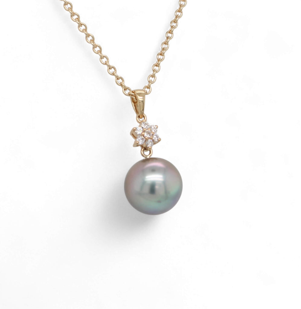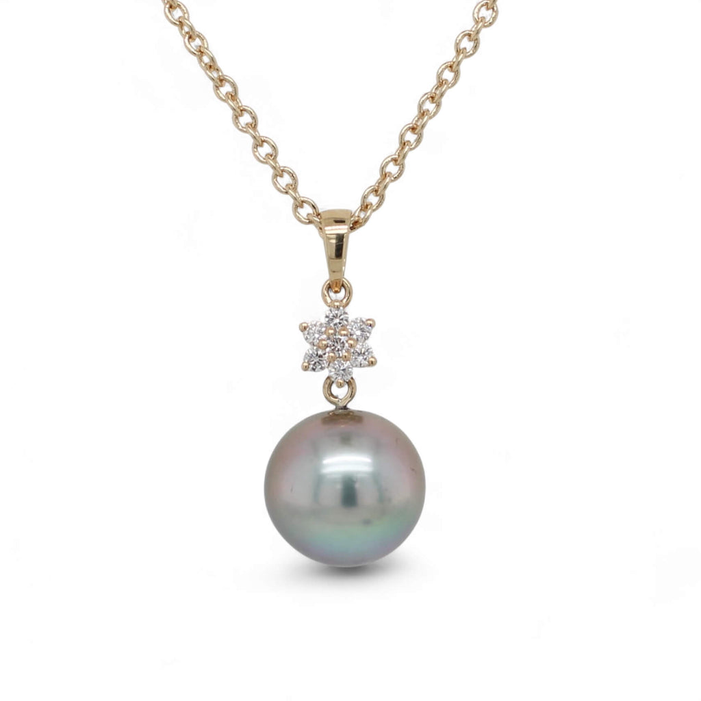 This pendant features a classic cluster of diamonds, paired with an articulated bail. Below hangs an A-grade Abrolhos Island Black Pearl in a sleek drop shape, combining simplicity with refined craftsmanship for a timeless design.