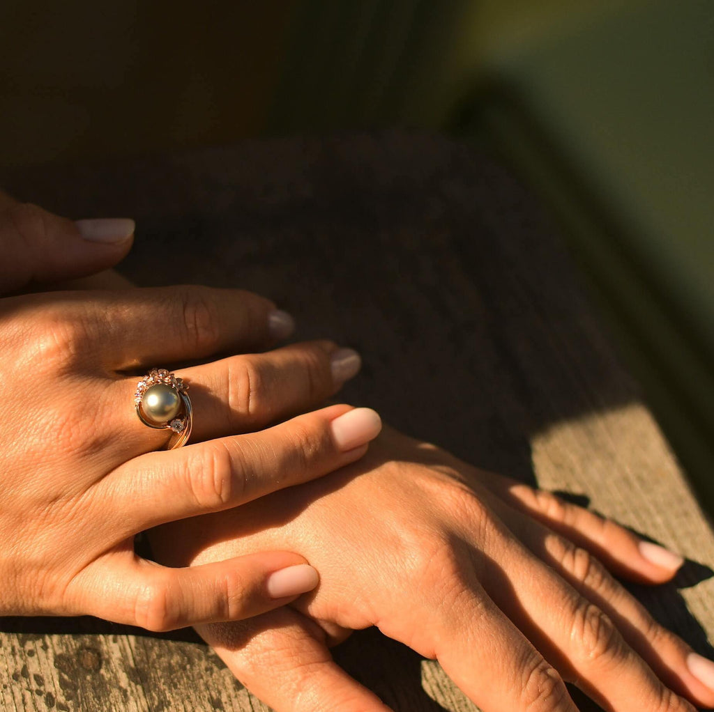 A fine White Gold wire adds contrast and fluidity, while the centrepiece—a radiant Abrolhos Island Black Pearl—honours our heritage and connection to the ocean. Grown on our own Latitude Pearl Farm, just 70km off the coast of Geraldton, this rare gem captures the essence of our Island Home.