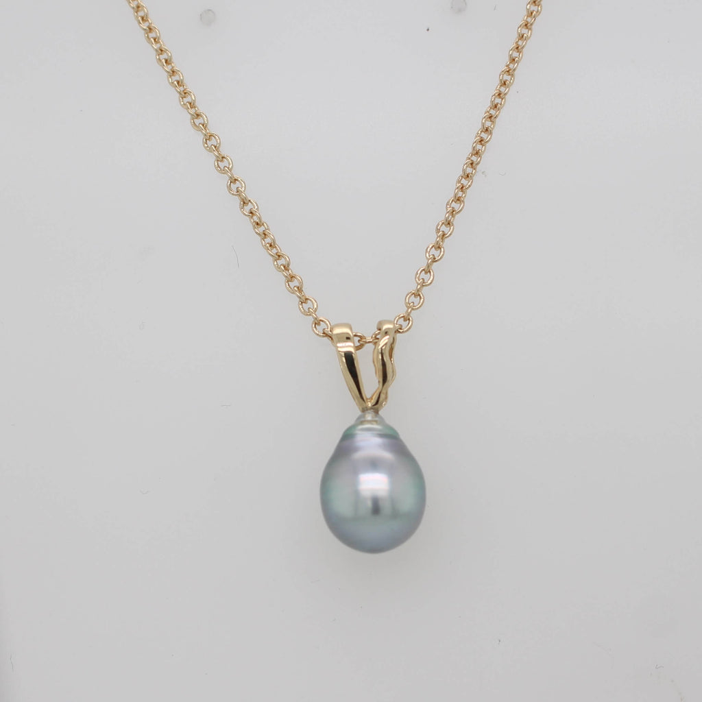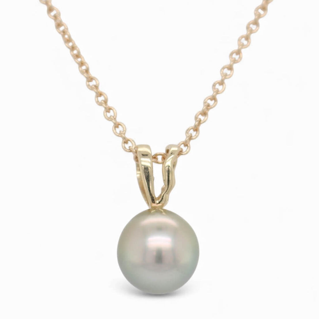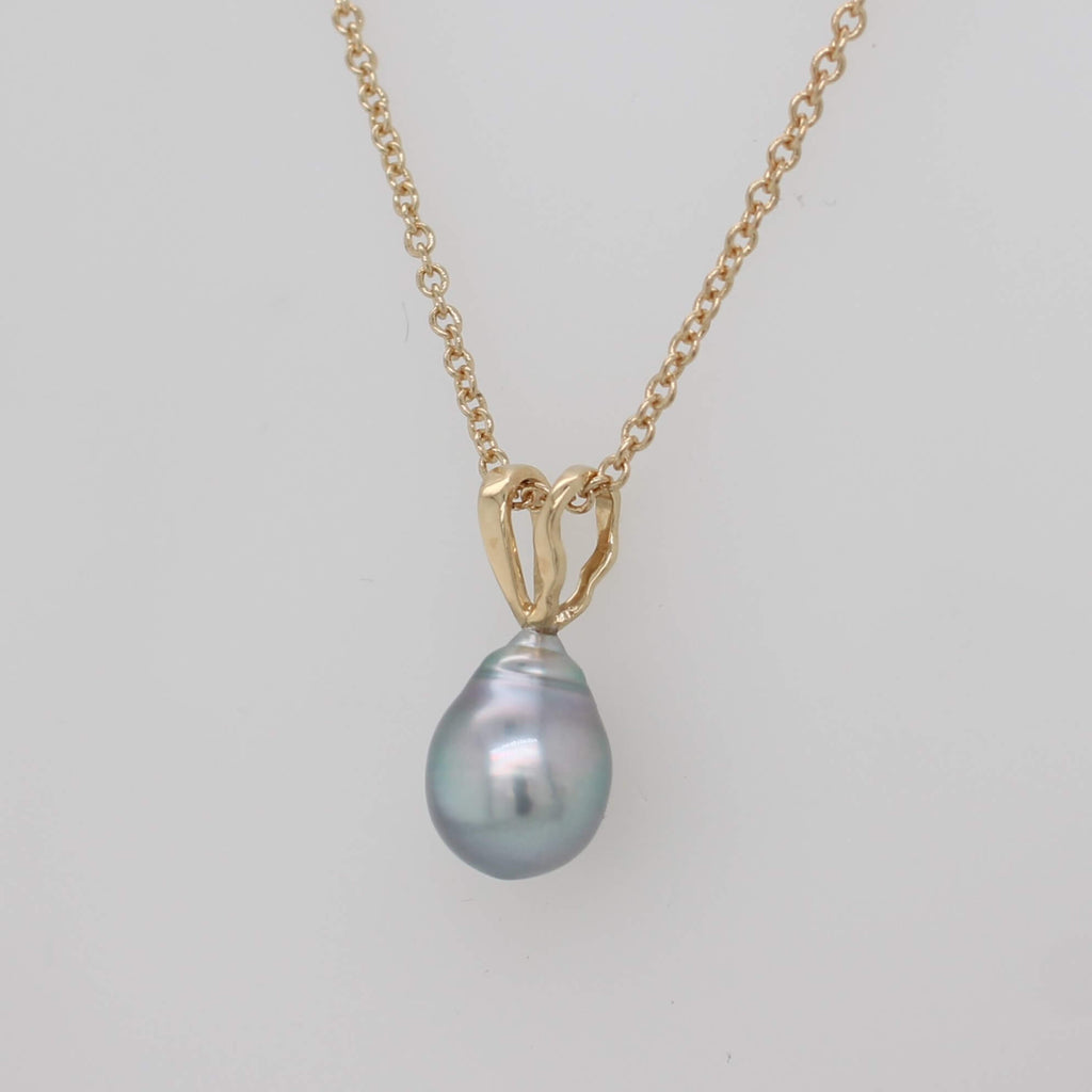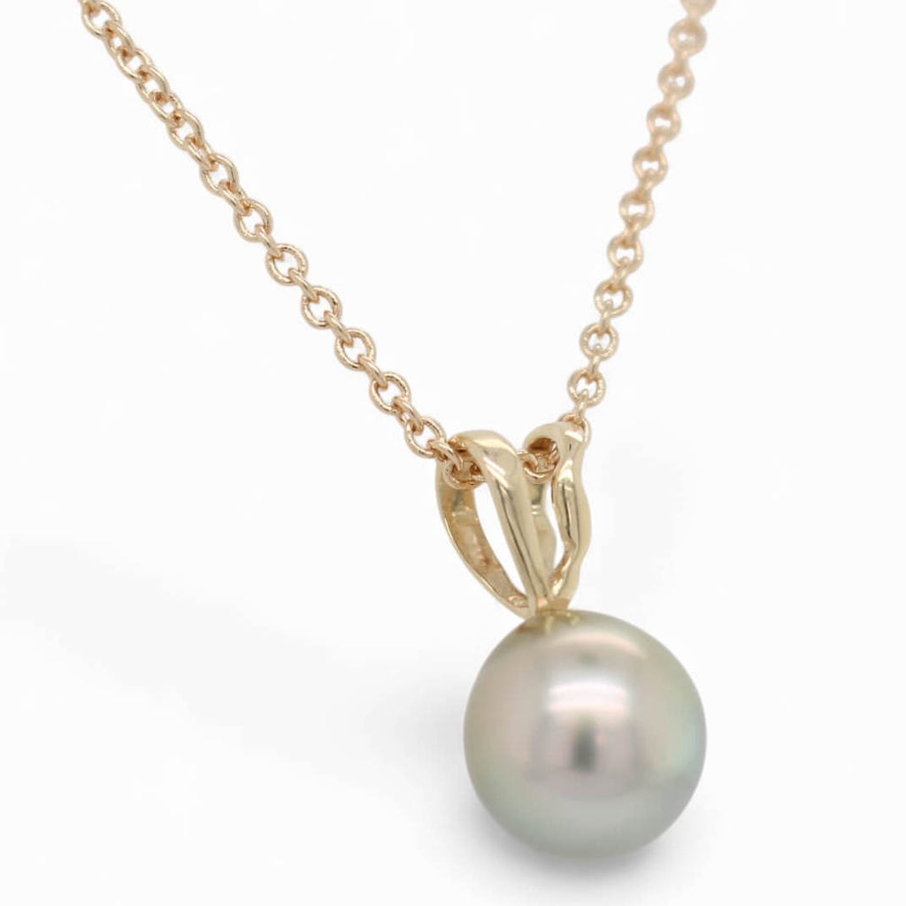 Product description: 9ct Yellow Gold Island Bound Collection Split Wave pendant featuring a 9.4-9.5mm Abrolhos Island Black Pearl round in shape.