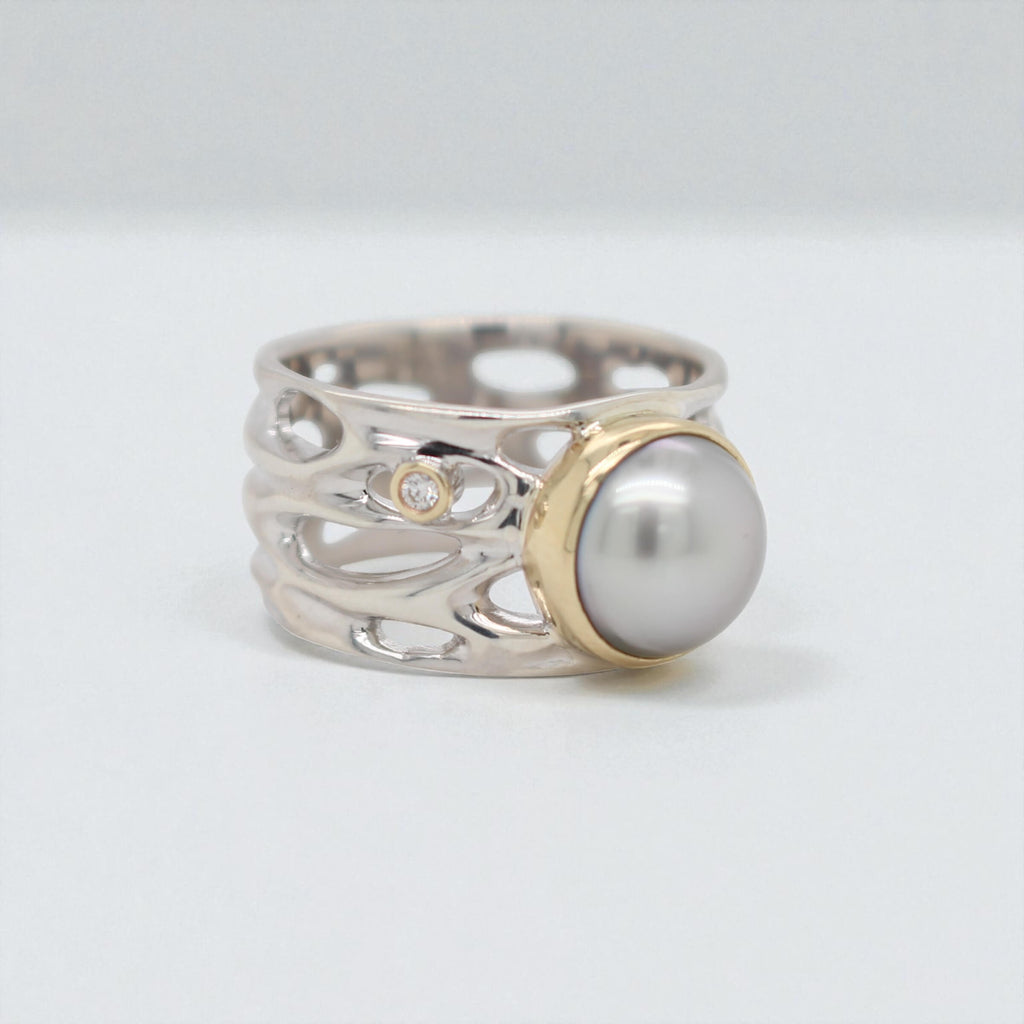 In this enhanced design, the ring features an Abrolhos Island Black Pearl, home-grown at our very own Pearl Farm at the Abrolhos Islands. A Diamond adds a touch of sparkle, reminiscent of sunlight dancing on tranquil waters.