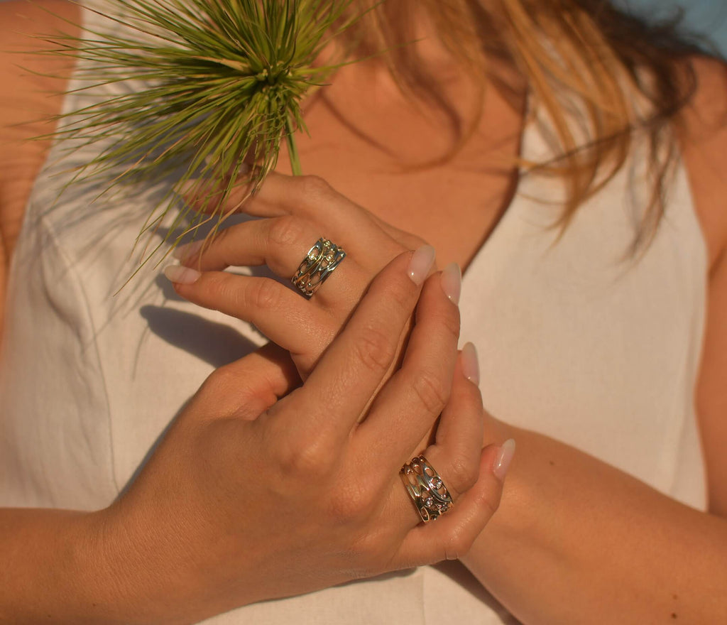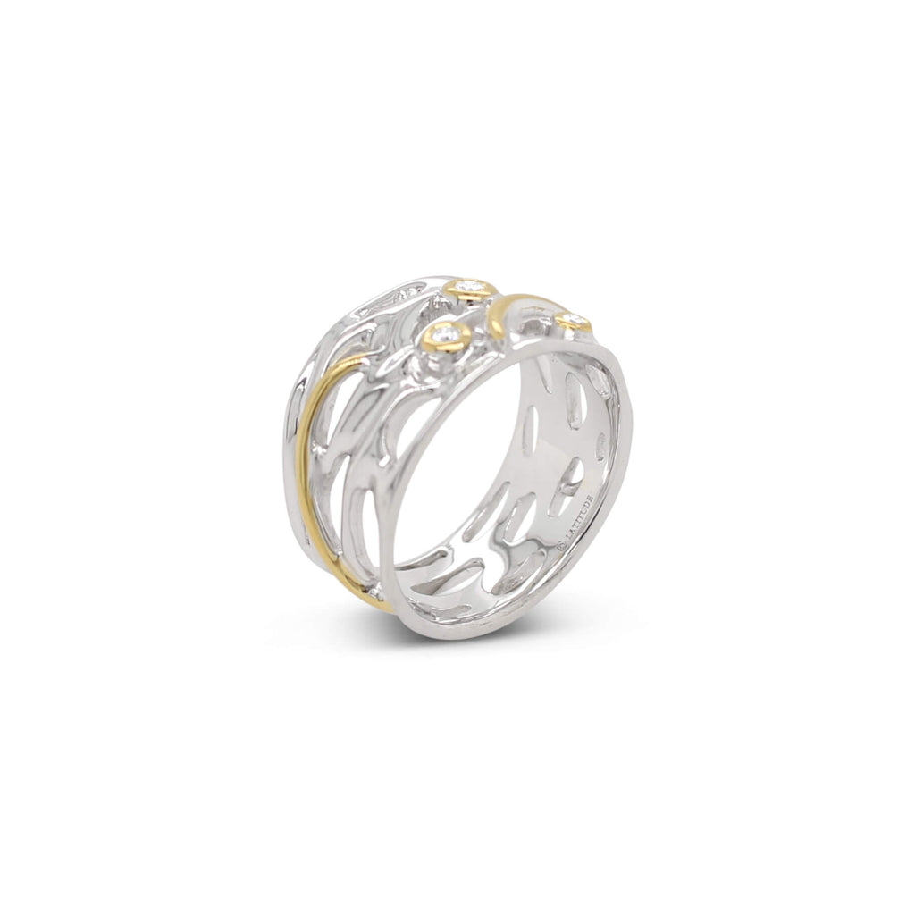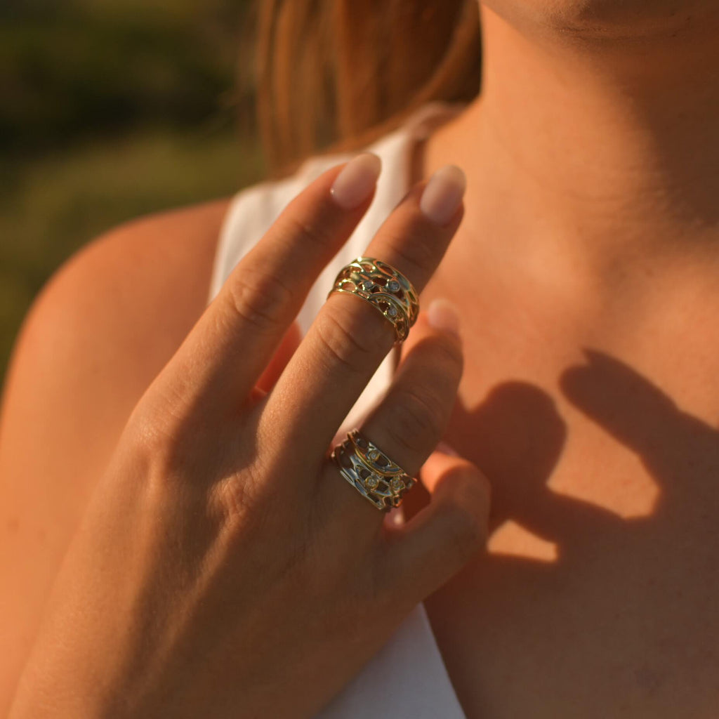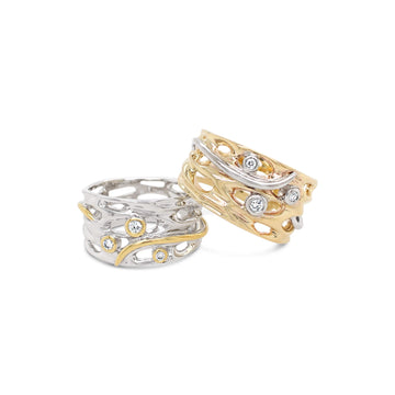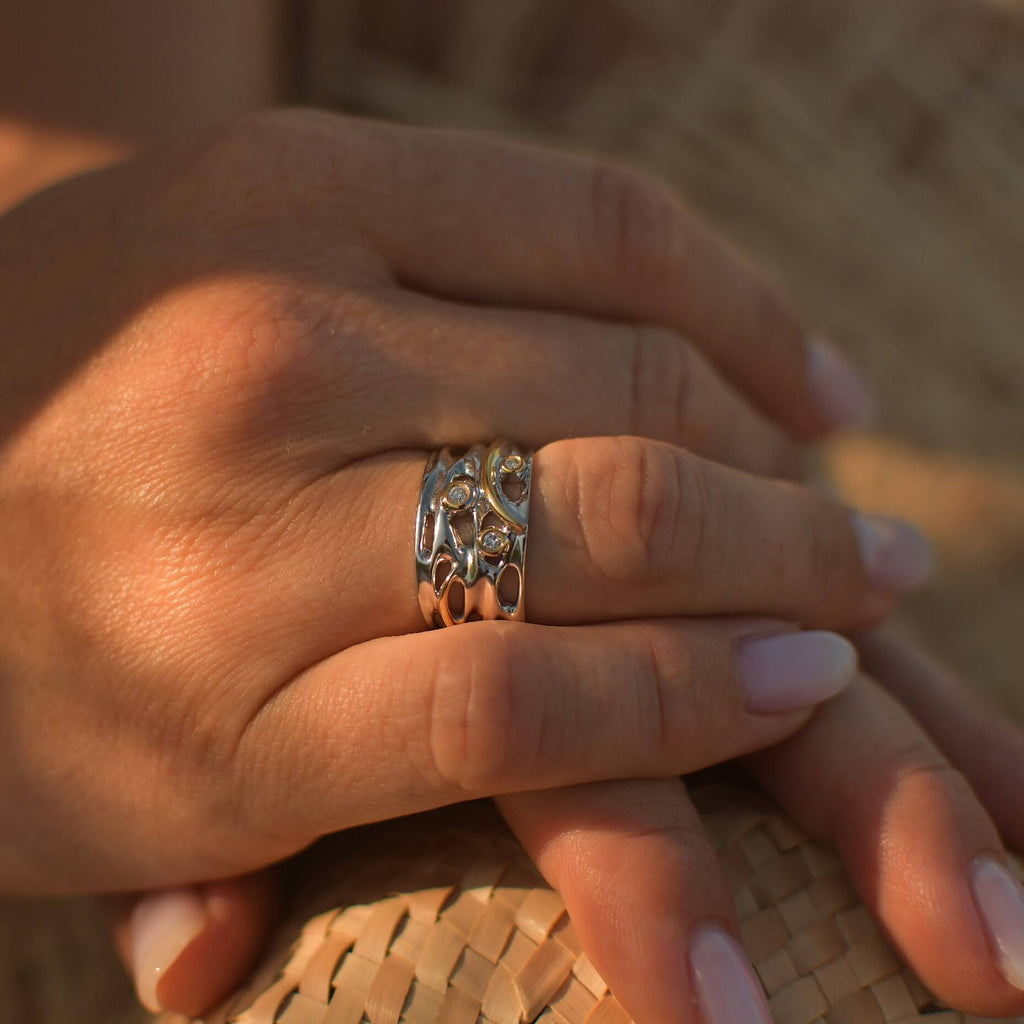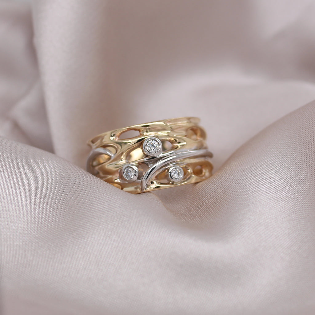 The combination of yellow and white metals, and diamonds create a harmonious blend of elegance and luxury, making this ring a versatile and timeless addition to your jewellery collection. Embrace the tranquility of the Oily Calm Collection and experience the serenity of nature's beauty.