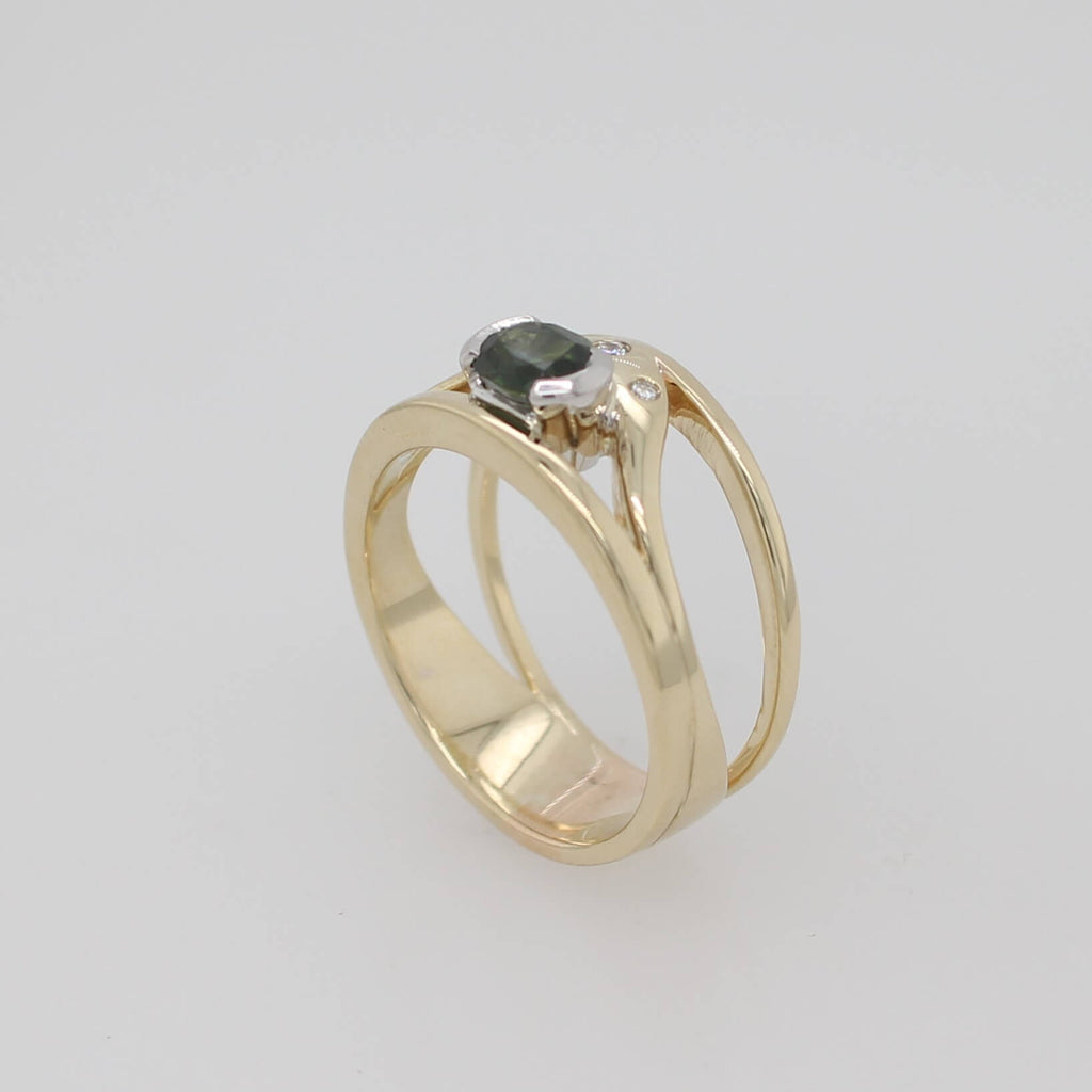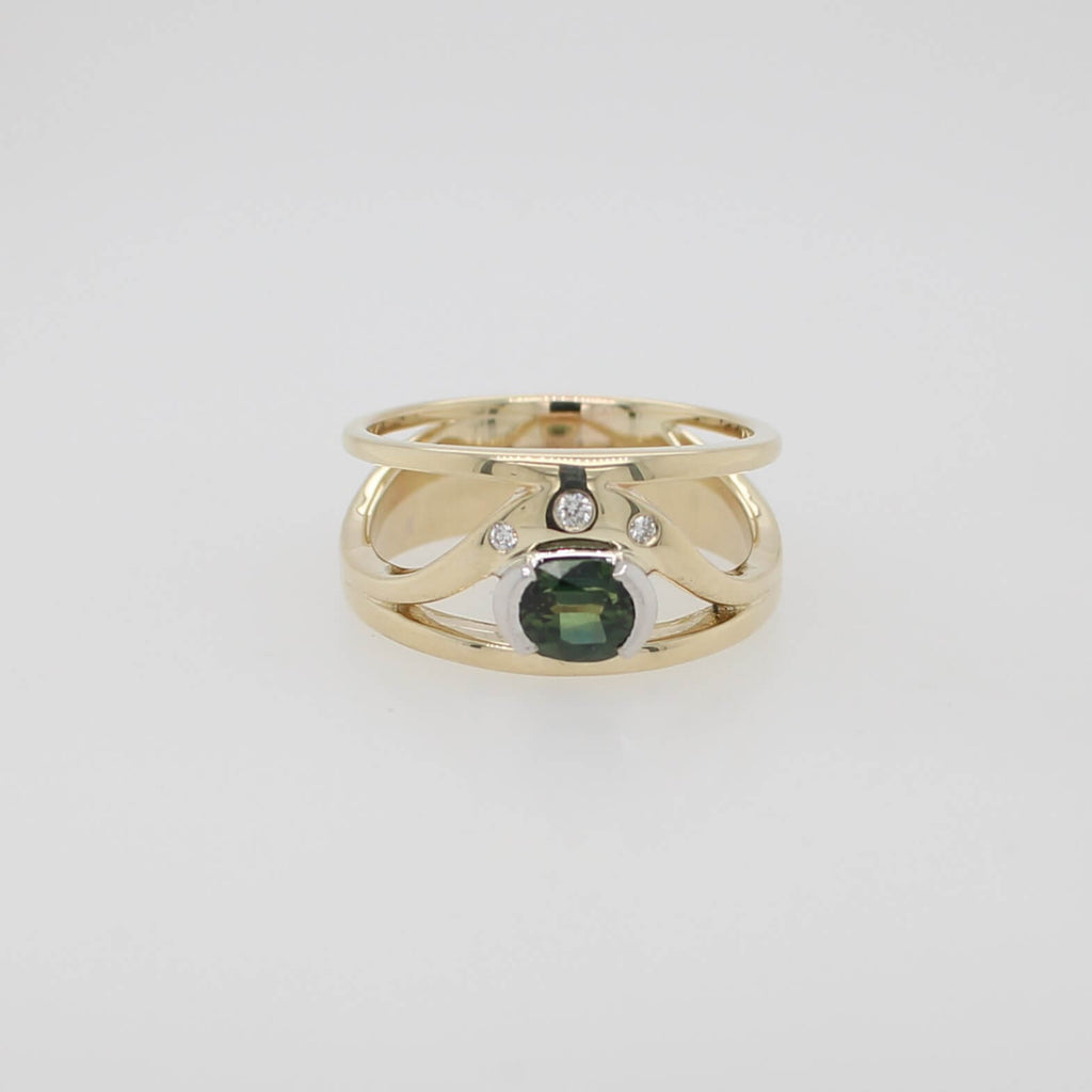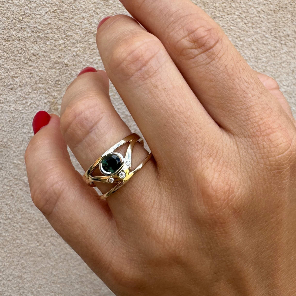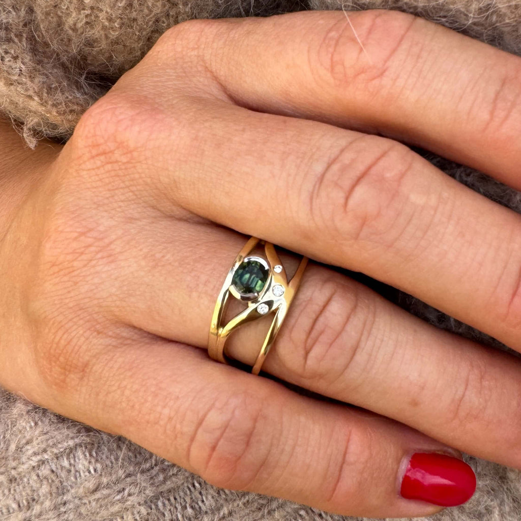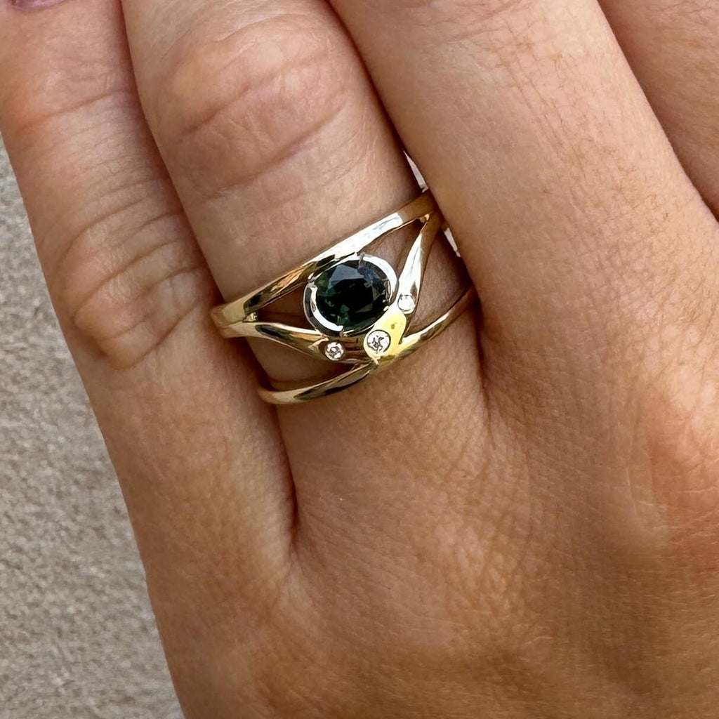 The Sapphire and Diamond Bellini Ring is a stunning piece that highlights the unique beauty of an Australian Sapphire, set in a sleek white gold half bezel to make the stone the focal point. The contrasting yellow gold band adds sophistication, while three sparkling white diamonds complete the design, making this ring a perfect blend of elegance and uniqueness.