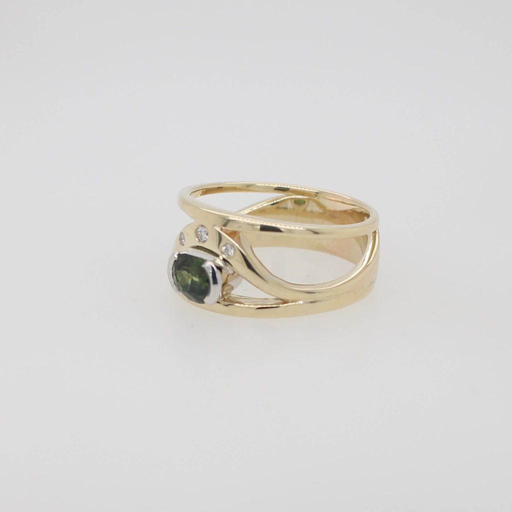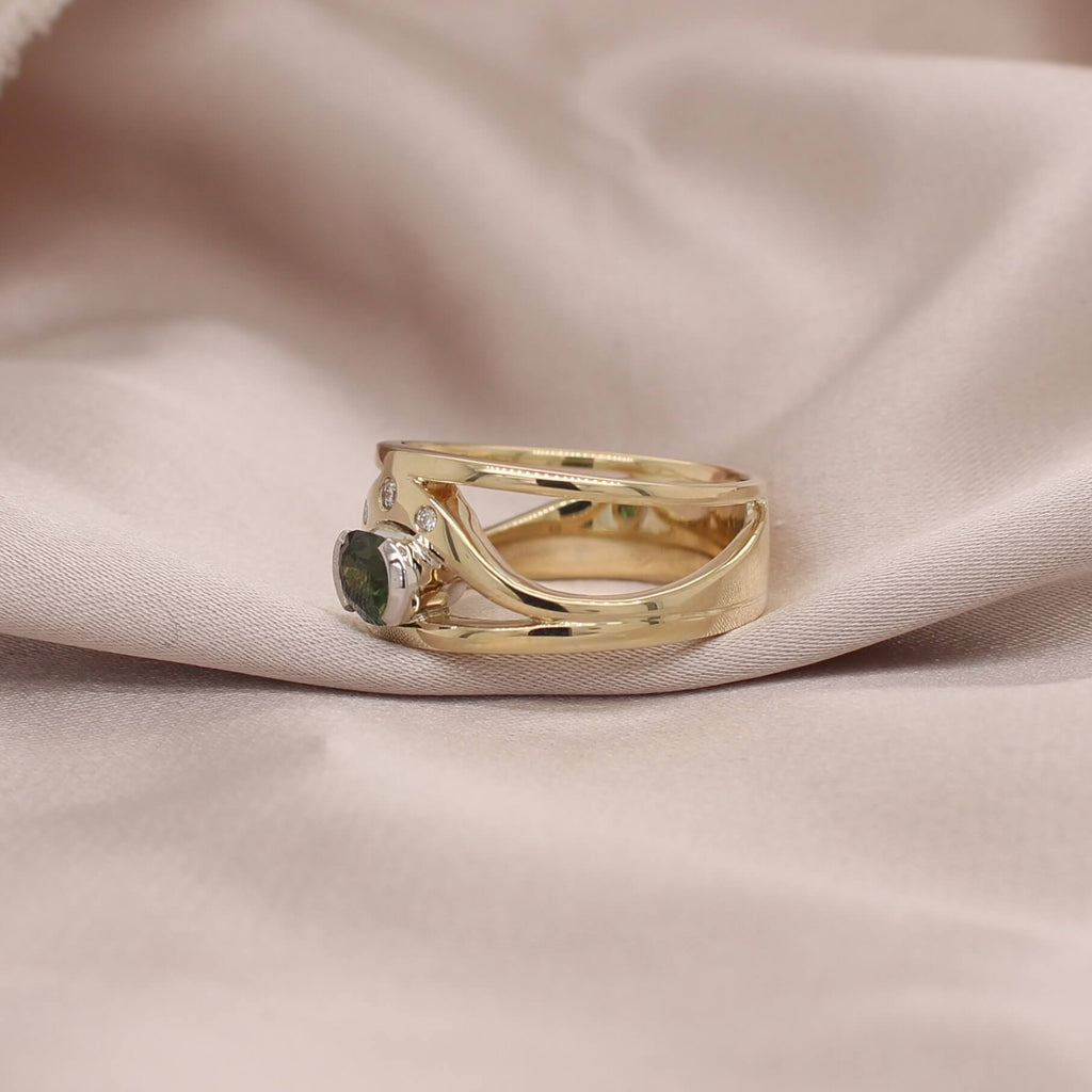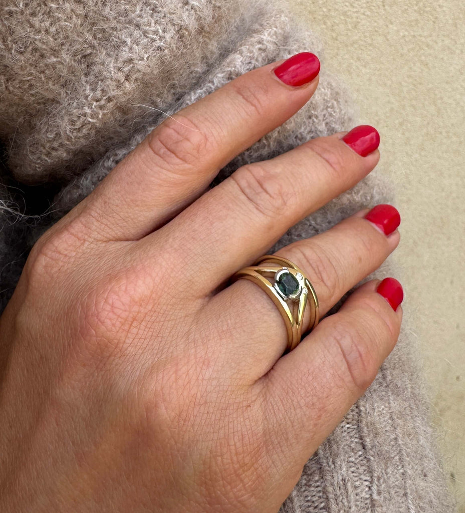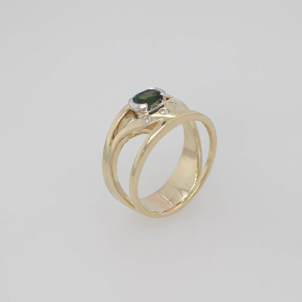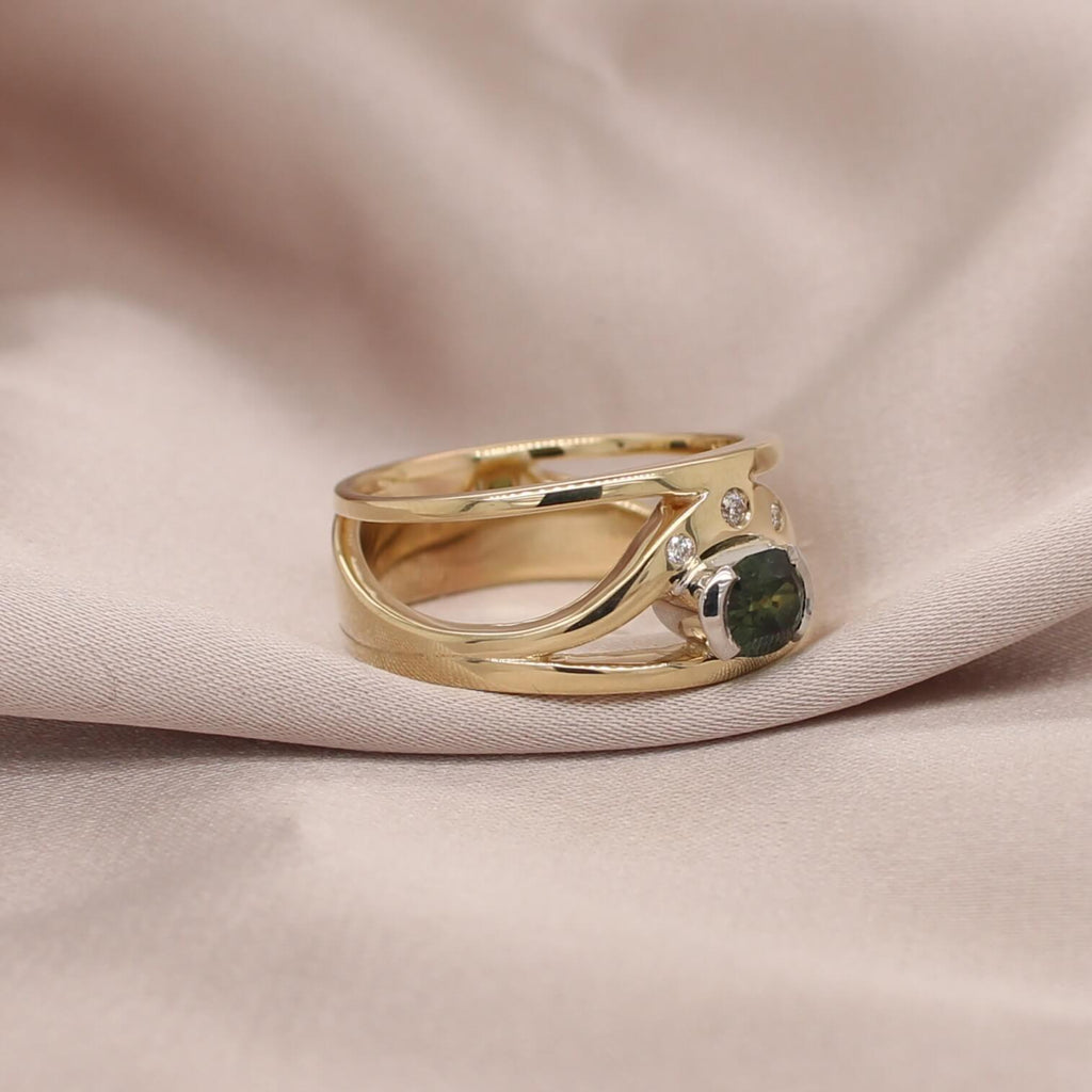 The Sapphire and Diamond Bellini Ring is a stunning piece that highlights the unique beauty of an Australian Sapphire, set in a sleek white gold half bezel to make the stone the focal point. The contrasting yellow gold band adds sophistication, while three sparkling white diamonds complete the design, making this ring a perfect blend of elegance and uniqueness.