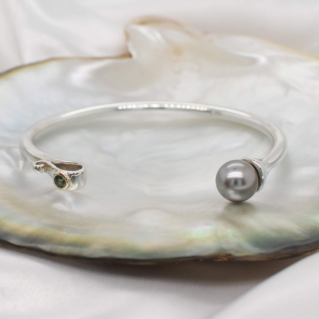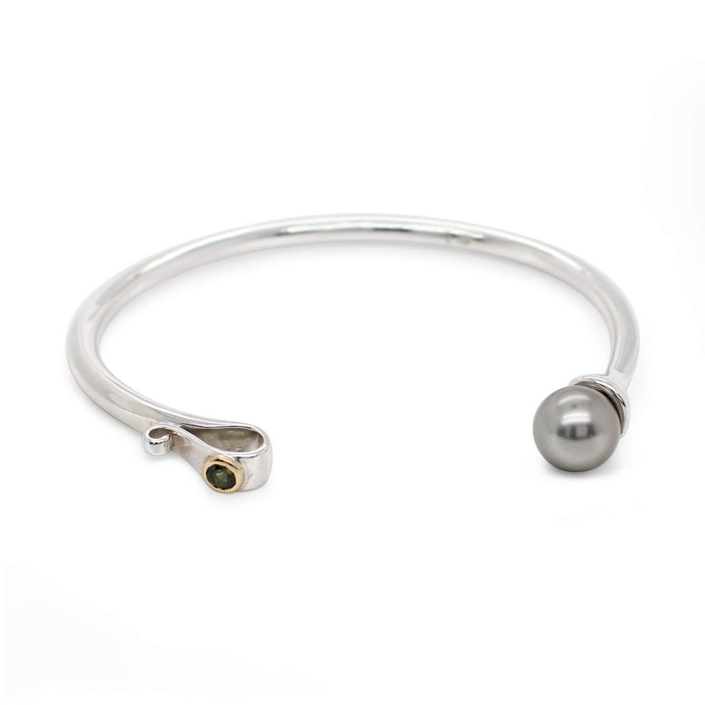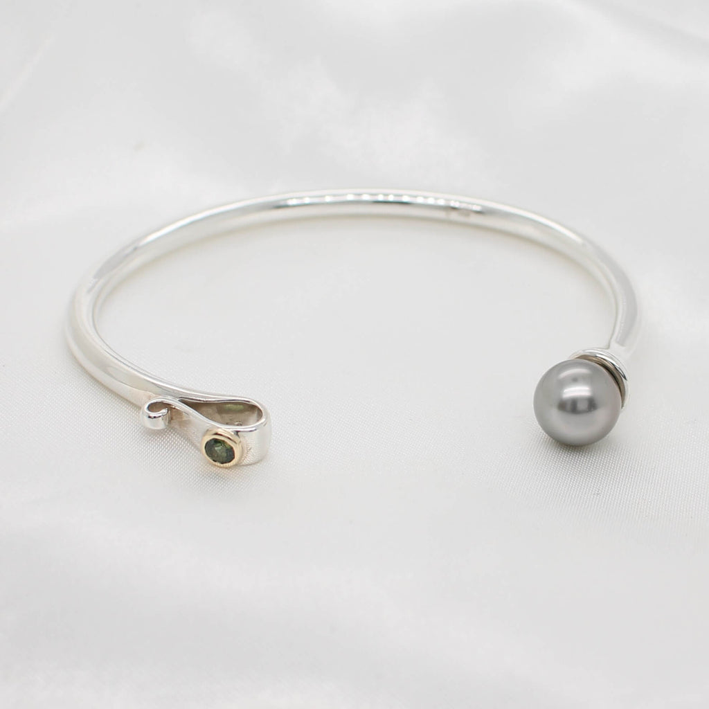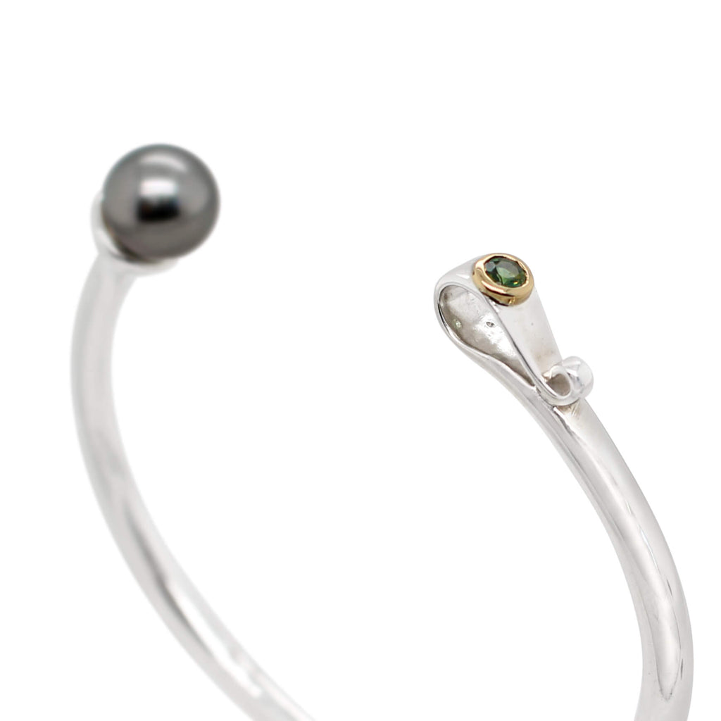 A Goddess Cuff featuring a 2.9mm Round brilliant cut Australian Parti Sapphire bezel set an Abrolhos Island Black Pearl. Elegant and unique ! Made in your choice of Sterling Silver or 9ct yellow gold. * Pearl colour may vary Ref: P6679 |