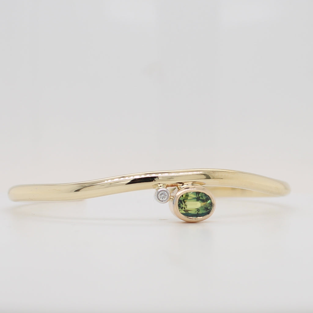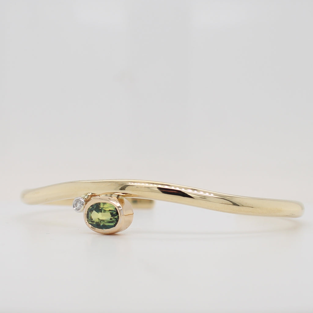 Handcrafted in Gold, this sculptural cuff wraps gracefully around the wrist. It features an exquisite Australian Parti Sapphire, known for its breathtaking blend of blue, green, and yellow hues. All three colours often visible in a single stone. No two Parti Sapphires are ever alike, making this gem a rare and naturally occurring masterpiece. A delicate white diamond is set alongside the sapphire, reminiscent of the first evening star.