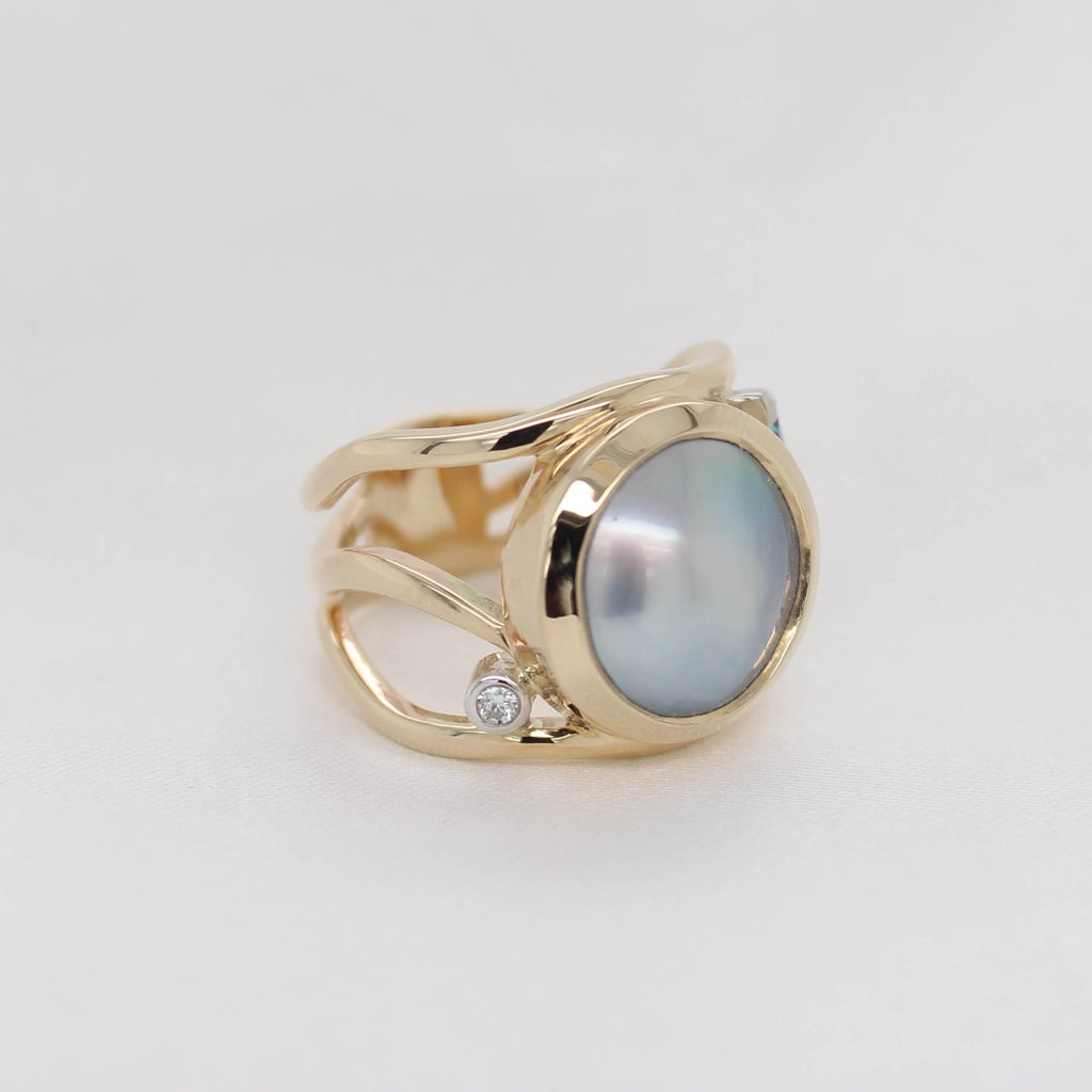 A statement piece in our beloved Lexi design, this wide open style features a luminous Abrolhos Island Black Mabe Pearl from our own pearl farm, paired with a serene aquamarine and a brilliant white diamond. Together, they create a harmonious blend of beauty, symbolism, and strength, made to be worn every day and treasured for a lifetime.