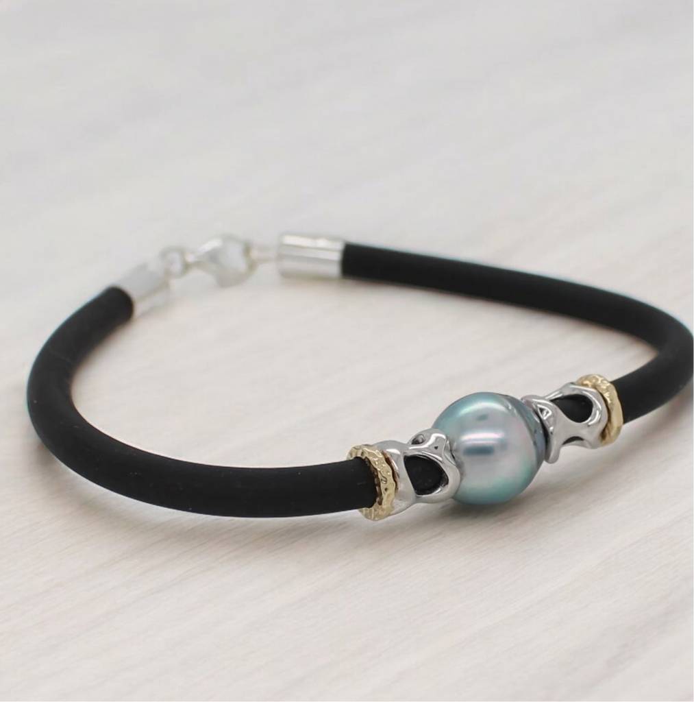 A unique and unisex Neoprene bracelet featuring an Abrolhos Island Black Pearl braced by 2 Sterling Silver collars and 2 9ct yellow gold cuffs. *Color of pearl may vary Ref: P10727