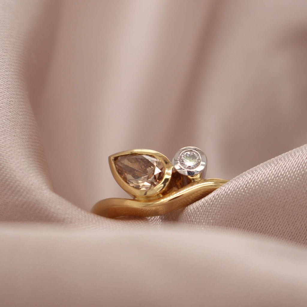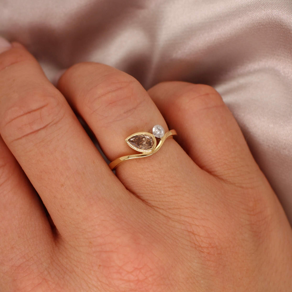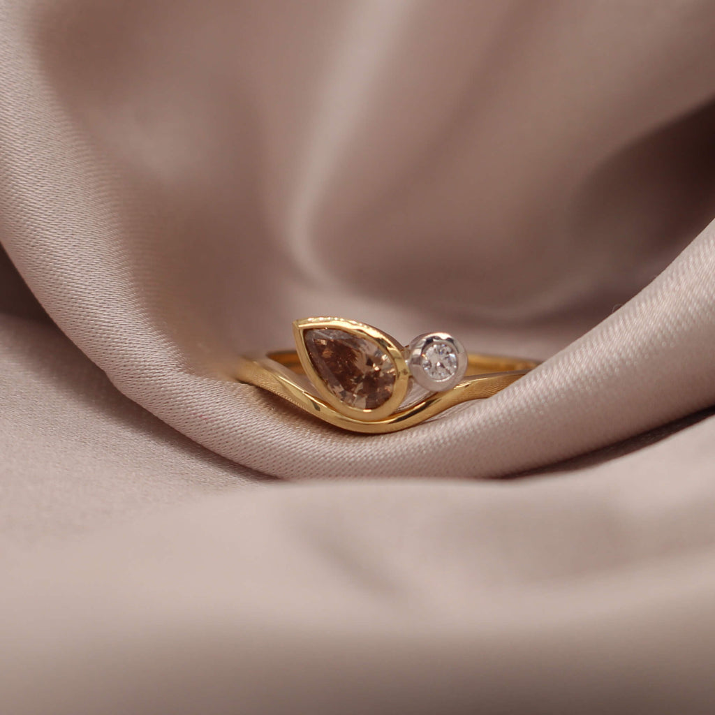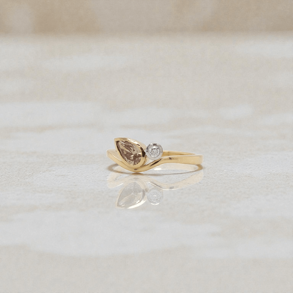 Crafted in 18ct Yellow and White Gold, this ring features a striking pair of diamonds from the world-renowned Argyle Mine in Western Australia. A beautiful pear-cut champagne diamond is paired with a brilliant white round diamond, both securely bezel set.