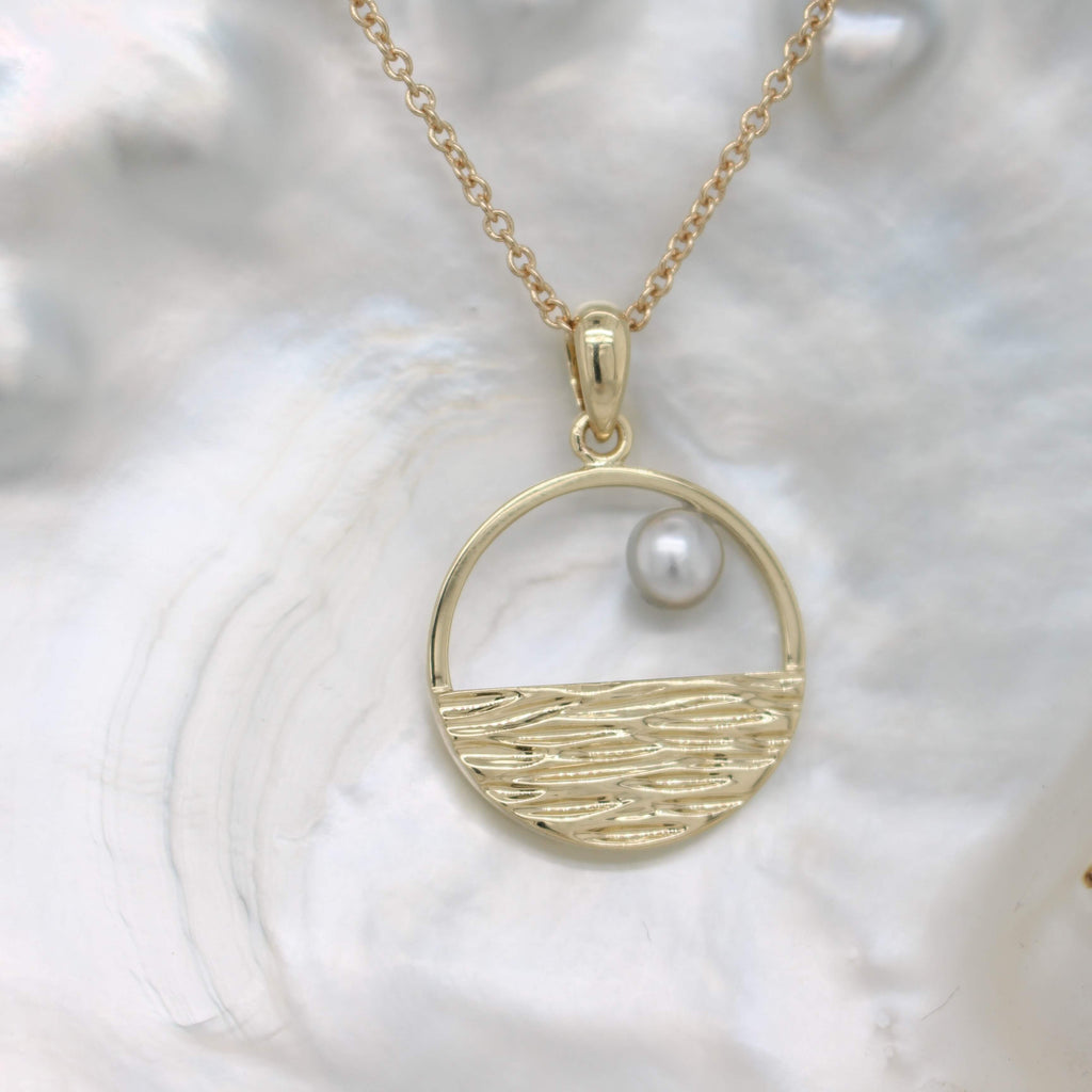 Crafted in solid metal featuring carved designs reminiscent of the water’s surface this pendant are perfectly paired with our Abrolhos Island Keshi Pearls.